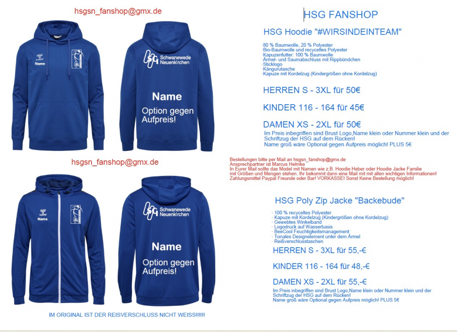Ihr möchtet passend im HSG-Blau gekleidet sein? Dann nutzt die Möglichkeit euch die Outfits schnell und unkompliziert zu bestellen.